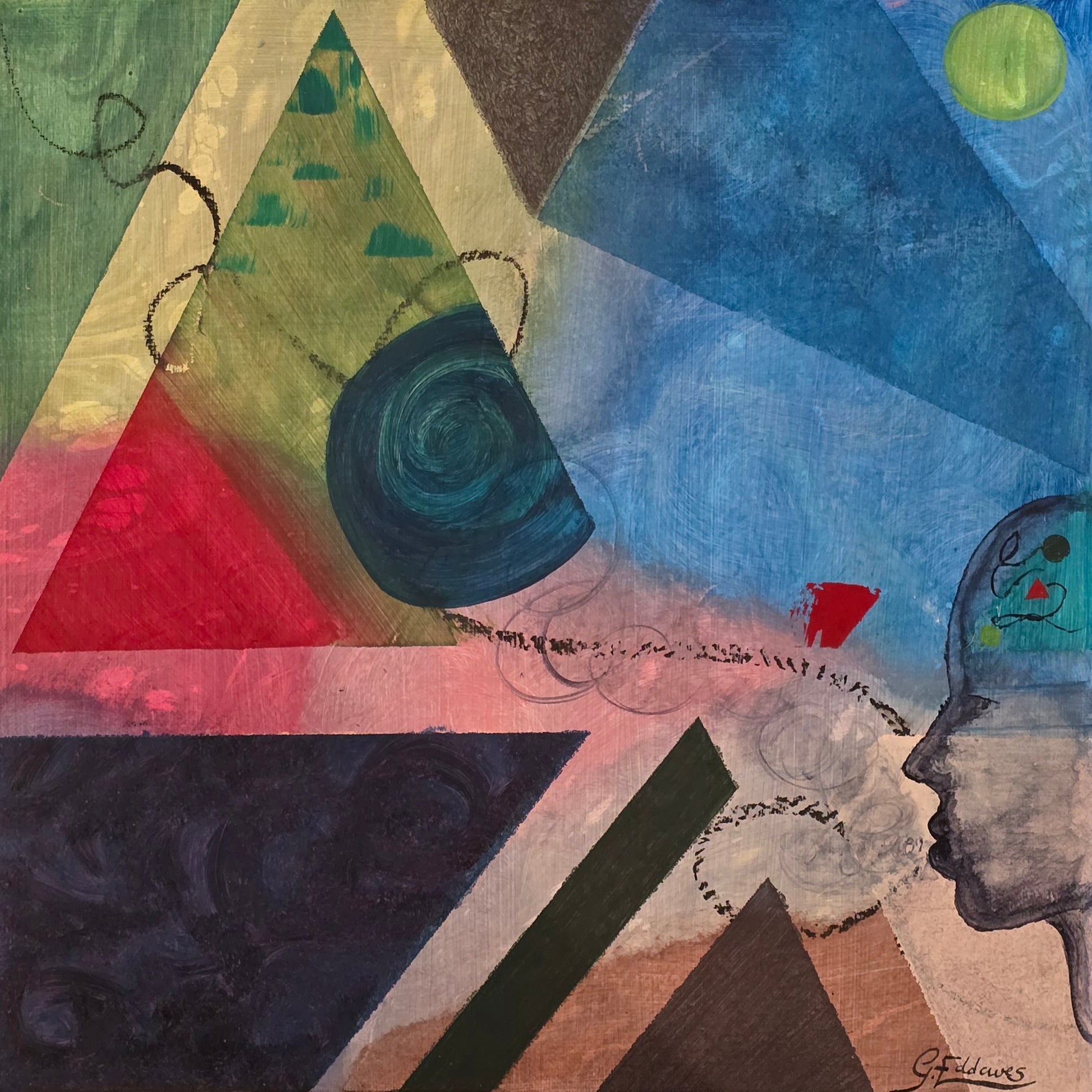 A burst of thoughts drifts from the figure’s mind, swirling into shapes, colours and geometric forms. The textured acrylic layers create a sense of movement and inner energy, as if imagination itself is spilling into the open air. A vibrant mix of structure and chaos, it captures the moment when ideas become almost too powerful to contain.