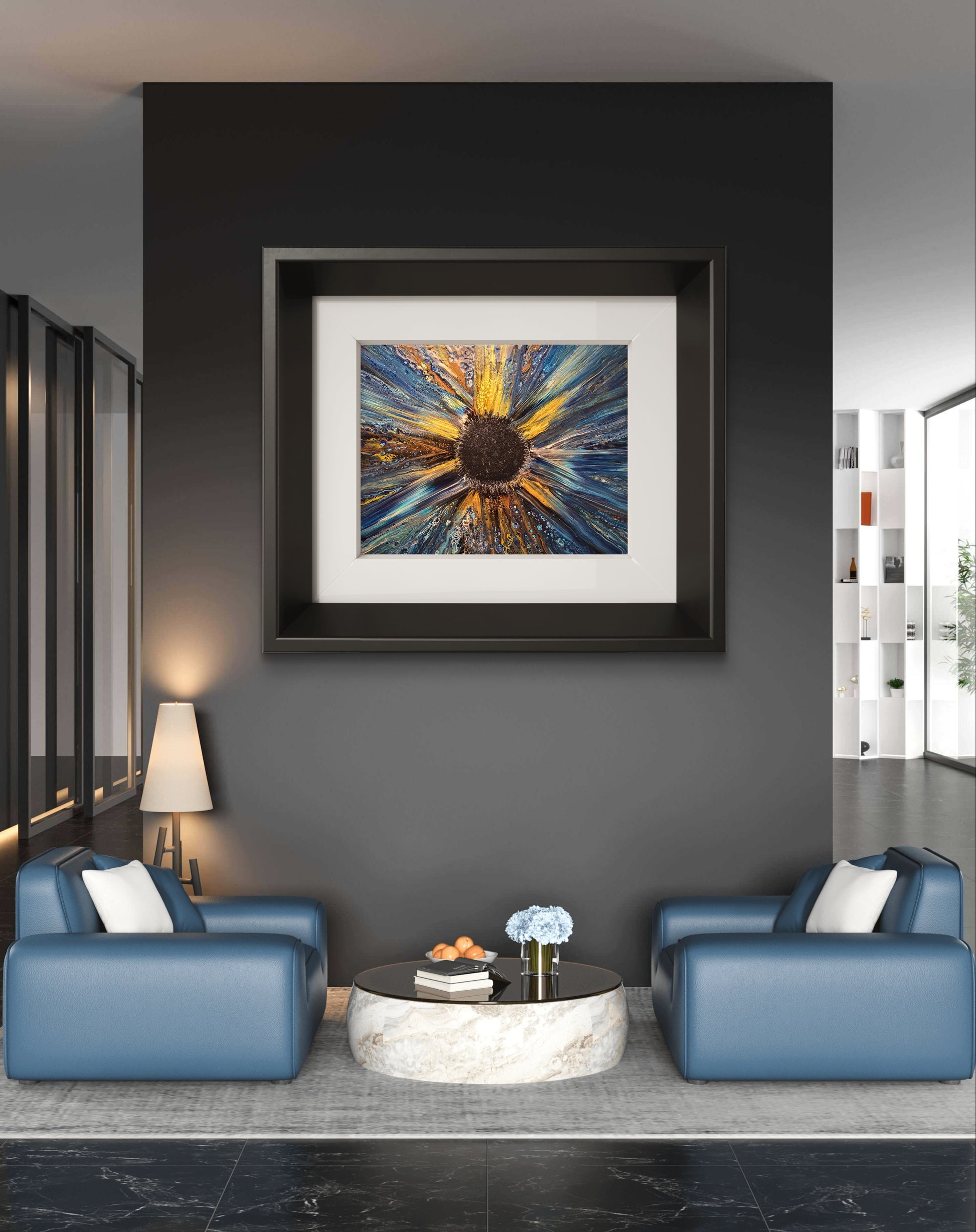 This piece radiates the essence of a sunflower reimagined through the language of energy and light. Bold strokes of gold, bronze, and cobalt burst from a deep, textured core, creating a sense of motion and vitality. The dynamic flow of color evokes sunlight scattering through space, blending nature’s organic beauty with cosmic power. Layers of detail and fluid textures draw the viewer inward, suggesting both growth and infinite expansion. A celebration of strength, warmth, and transformation, this artwork captures the eternal dialogue between darkness and illumination, grounding and freedom—a sunflower igniting with the brilliance of the universe.
