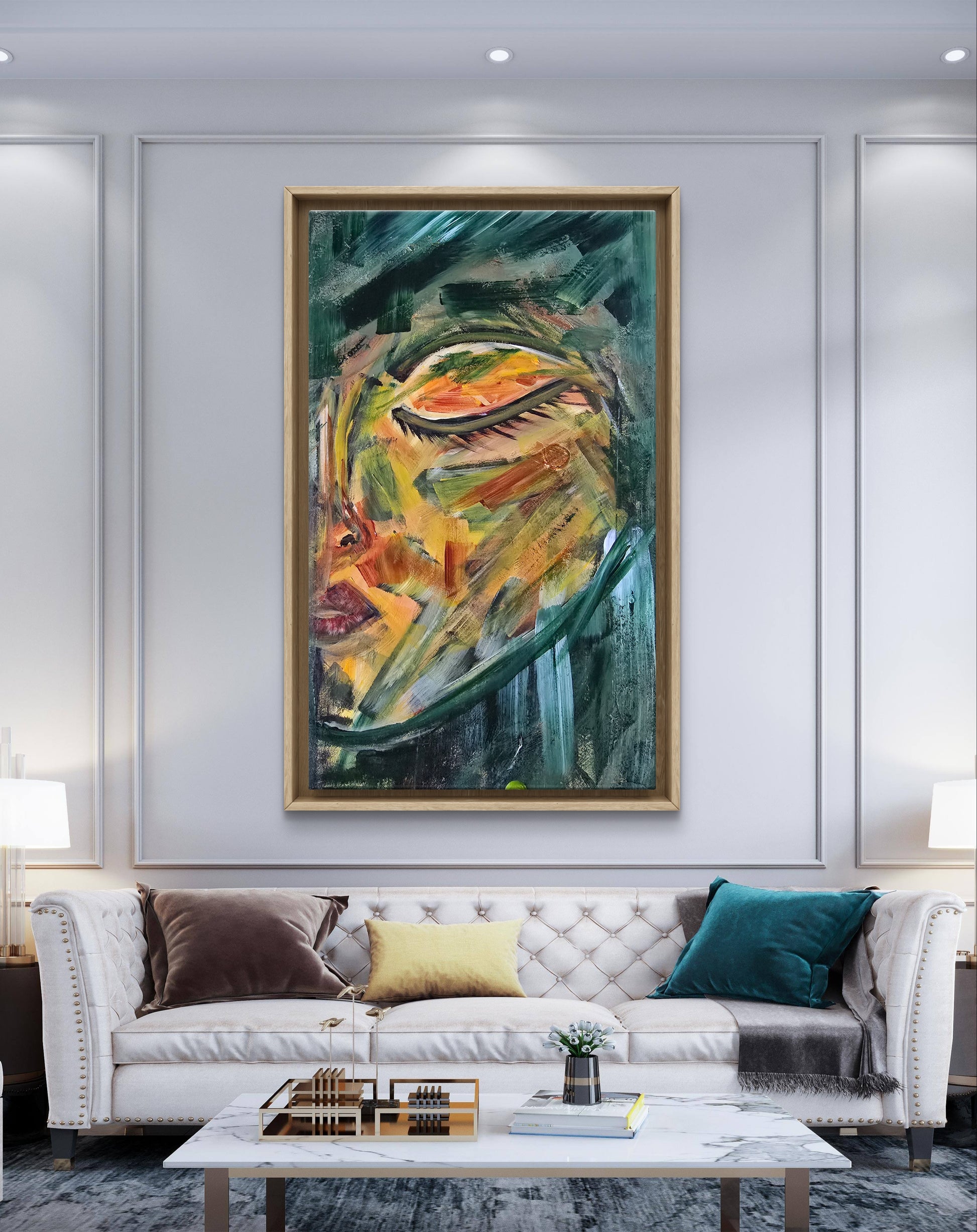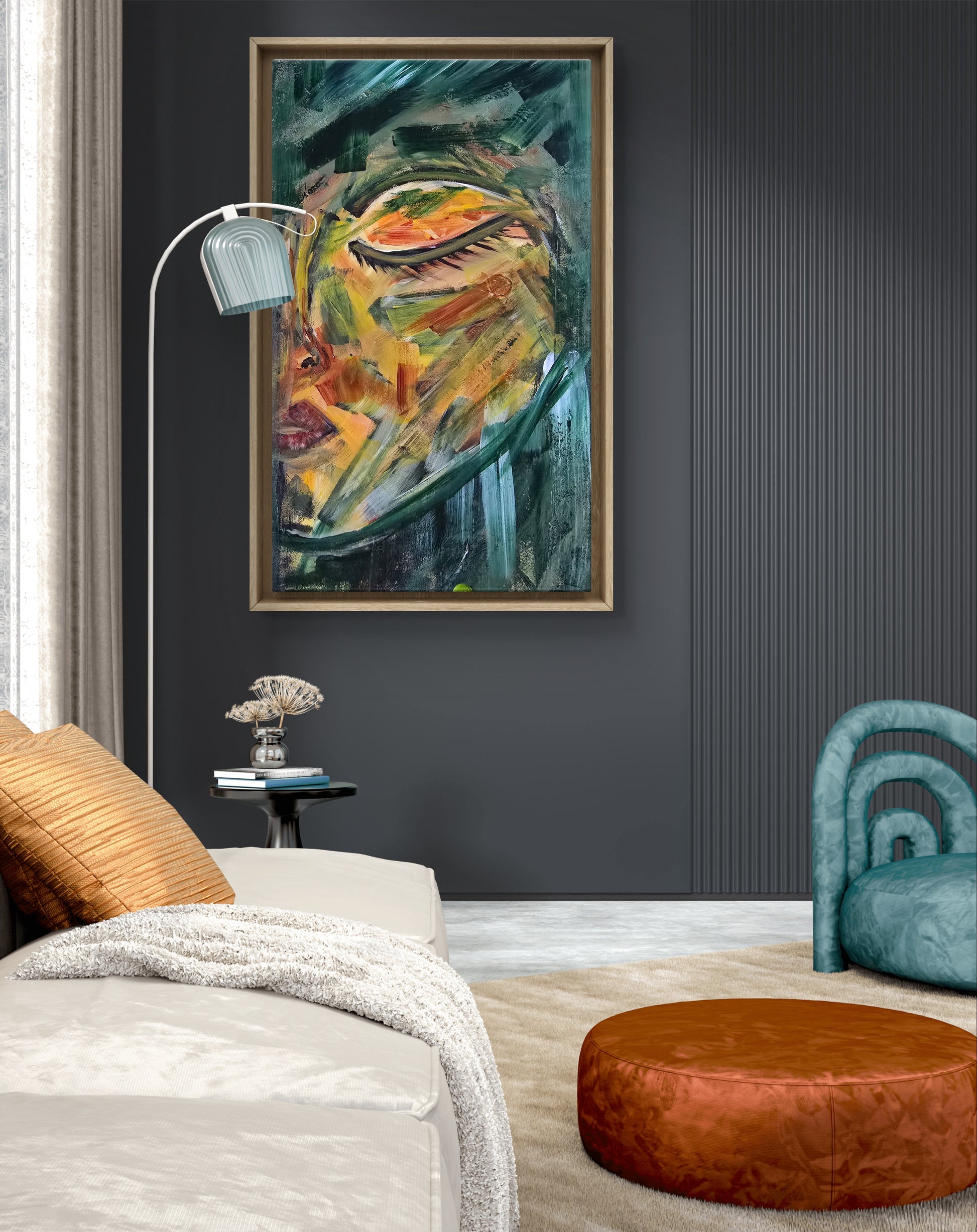 A contemplative portrait emerges through bold, expressive brushstrokes and earthy tones. “Veil of Reflection” captures a quiet moment of introspection, blending abstract forms with subtle emotion. The layered textures invite viewers to explore the hidden depths within.