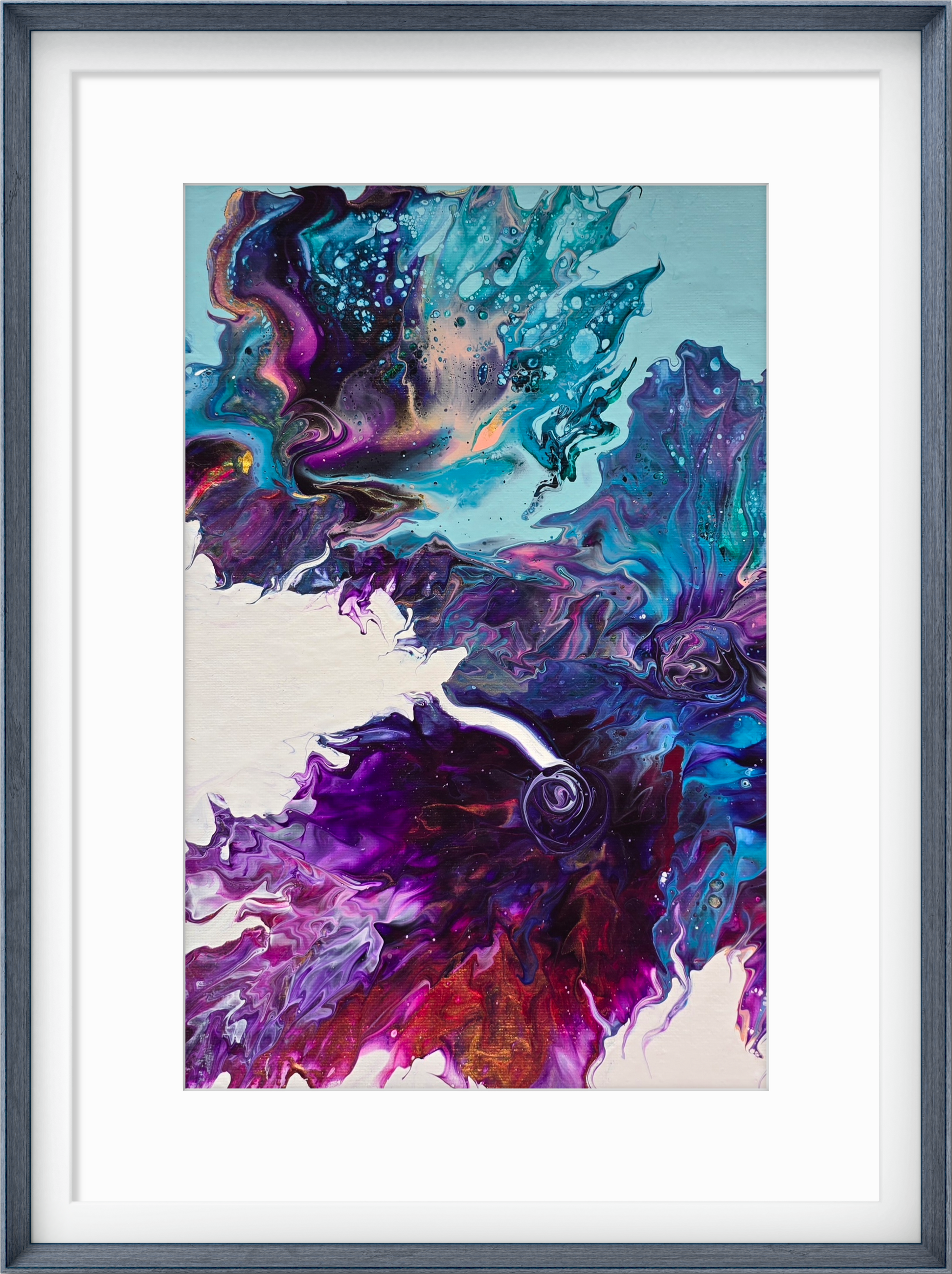 A vibrant abstract that flows like petals drifting beneath the sea. Rich purples, deep blues, and turquoise tones ripple together with luminous highlights, creating a sense of movement and depth. A striking piece that brings both energy and calm to any space.