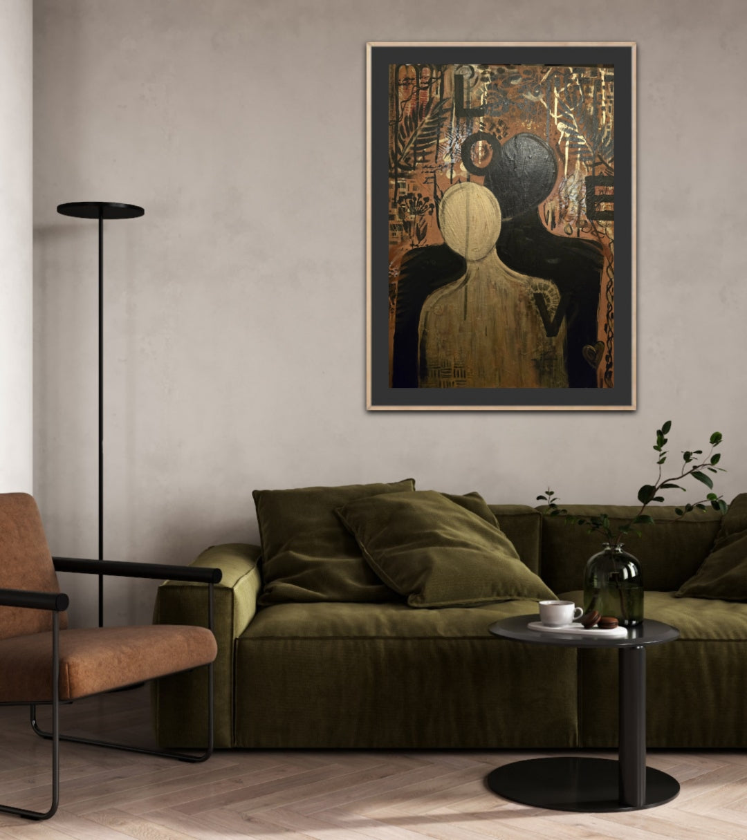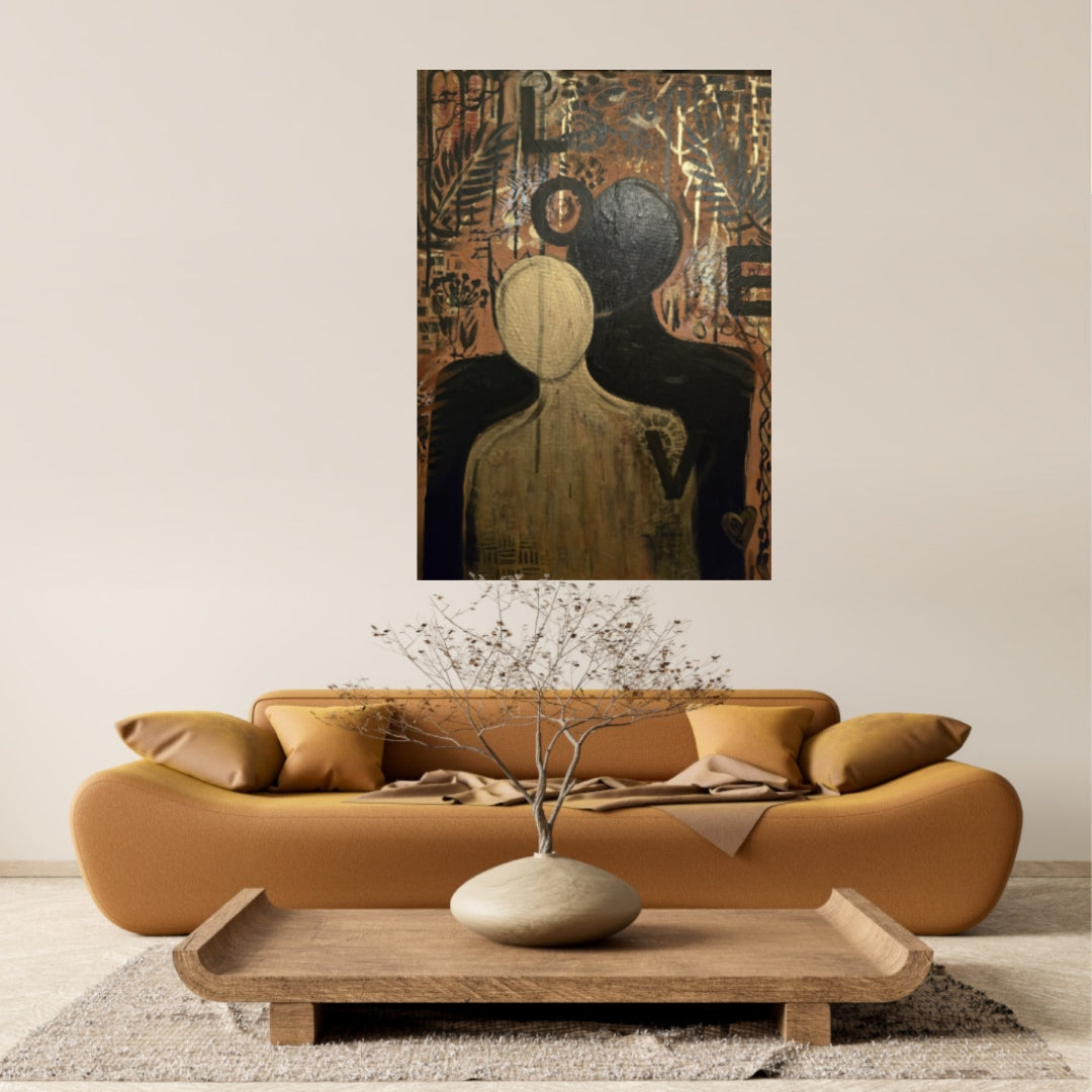 “Silent Embrace” captures a moment of deep, wordless connection. Two abstract figures merge in soft gold and shadowed tones, symbolising comfort, protection, and the quiet strength found in simply being held. The textured background adds warmth and emotion, echoing the tenderness at the heart of the piece.
