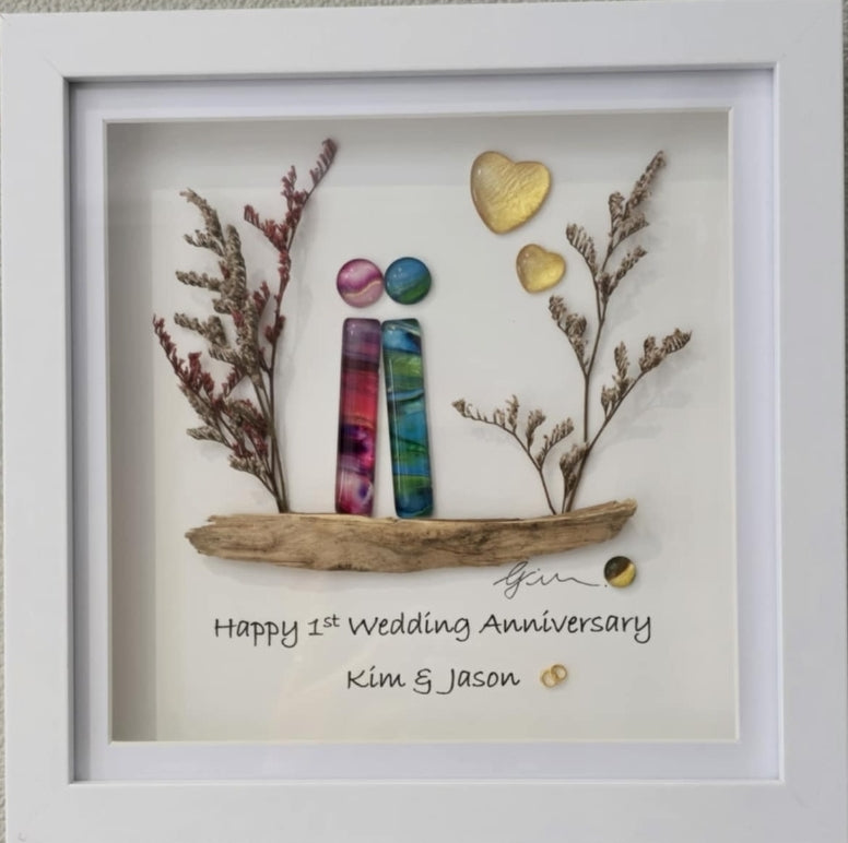 Celebrate life’s special moments with a unique, handcrafted shadow box art piece. Each design is lovingly created using natural driftwood, delicate botanicals, and vibrant fused glass to capture the essence of your story. Customisable with names, dates, and heartfelt messages, this shadow box makes a perfect gift for weddings, anniversaries, or any special occasion. The 3D arrangement brings depth and warmth, while the elegant white frame ensures it suits any décor. Give a gift that’s as meaningful and lasting as your memories.
